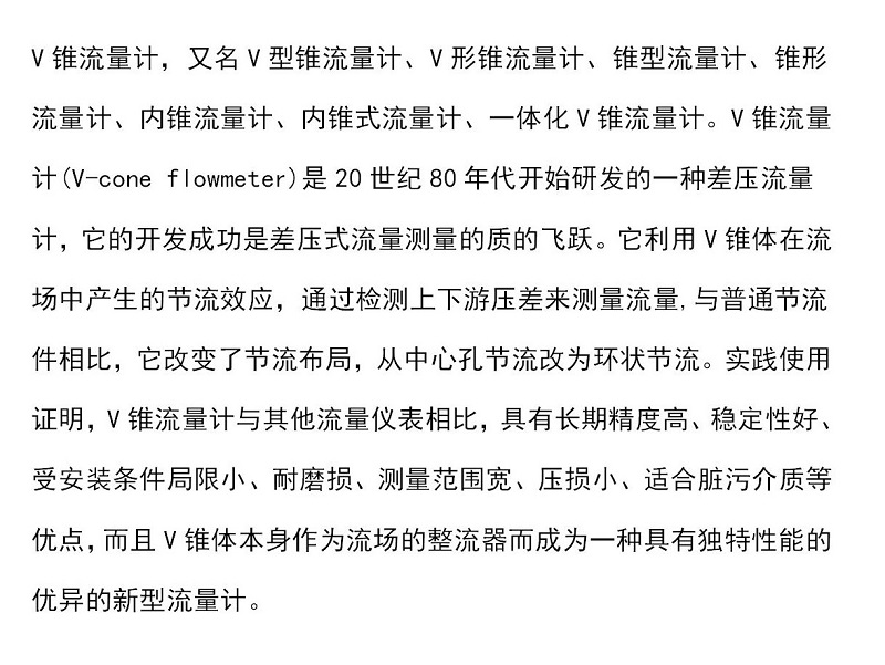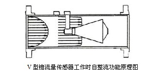 V型錐丝瓜视频在线免费观看是差壓式丝瓜视频在线免费观看,也是一種通過節流取差壓以反映流量大小的節流裝置。節流件為一個懸掛在管道中央的錐形體,高壓P1取自錐體前流體未擾動(即未形成節流,流體未加速)的管壁 ;低壓P2取自後錐體中央,並通過引壓管引至管外,它遵從基於封閉管道中能量相互守恒的伯努力原理:當管內流體流經管內正中錐體時,流體逐步被壓縮,流速加快而動能增加,此增加的動能,經錐體直徑最大處後逐步釋放而在錐體後邊產生一個低壓帶(相對於管道壓力),從而建立了流量與其流經V形錐前後所產生的差壓△P的平方根成正比。計算與孔板、噴咀等類似。