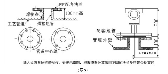 h、插入式丝瓜视频在线免费观看安裝時,將短管及法蘭焊到管道上時必須確保流體正對著靶片受力麵,焊接短管高度在100mm(從管道內壁至法蘭密封麵的距離);(圖9)